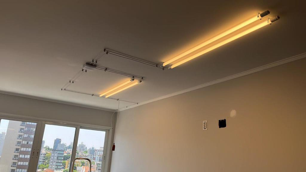 Era preciso reorganizar a disposição dos pontos de luz, que eram insuficientes e aumentar a quantidade de luz artificial disponível! Por isso, trabalhamos com caixas de passagem nos pontos de esperas de iluminação na laje, e, com desviadores e fios encapados, repensamos a disposição da iluminação existente.